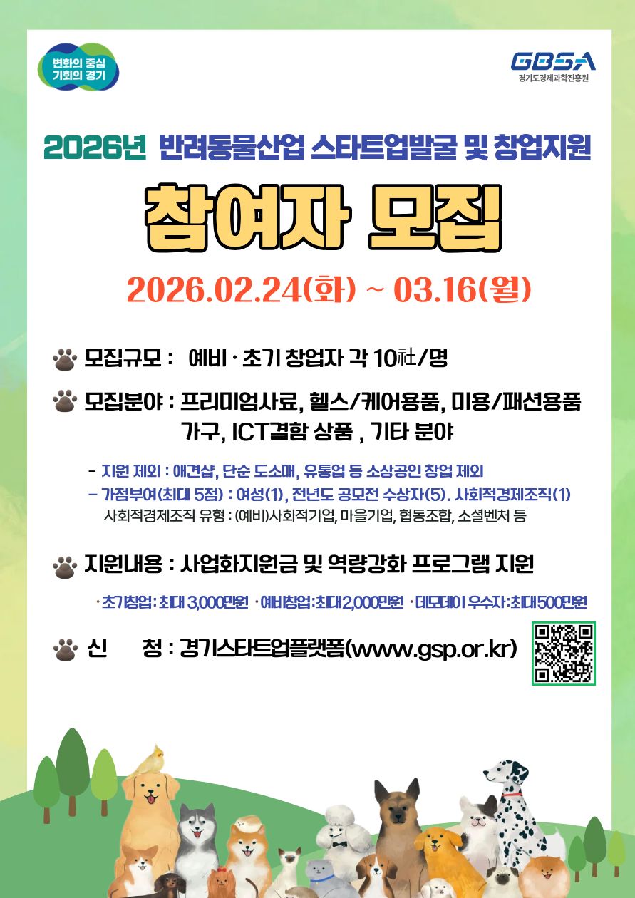 [경기도경제과학진흥원] 2026년 반려동물산업 스타트업발굴 및 창업지원사업 참여자 모집